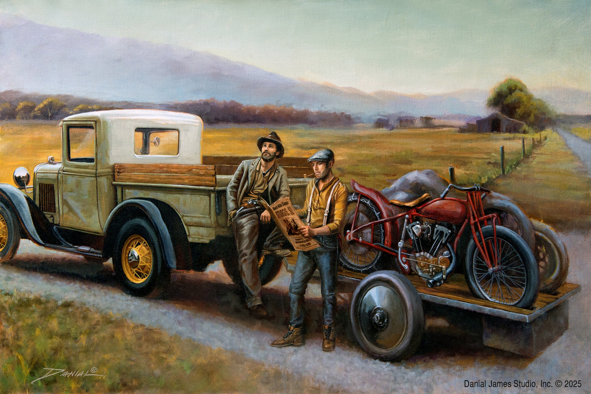 Taking a moment, on their way to a weekend of motorcycle racing, hill climbs and stunts, put on by the Jackpine Gypsies motorcycle club in Sturgis, SD. A couple good old boys stop to stretch their legs and look at the prior year's stats on the races and events back in the Good ol Days.